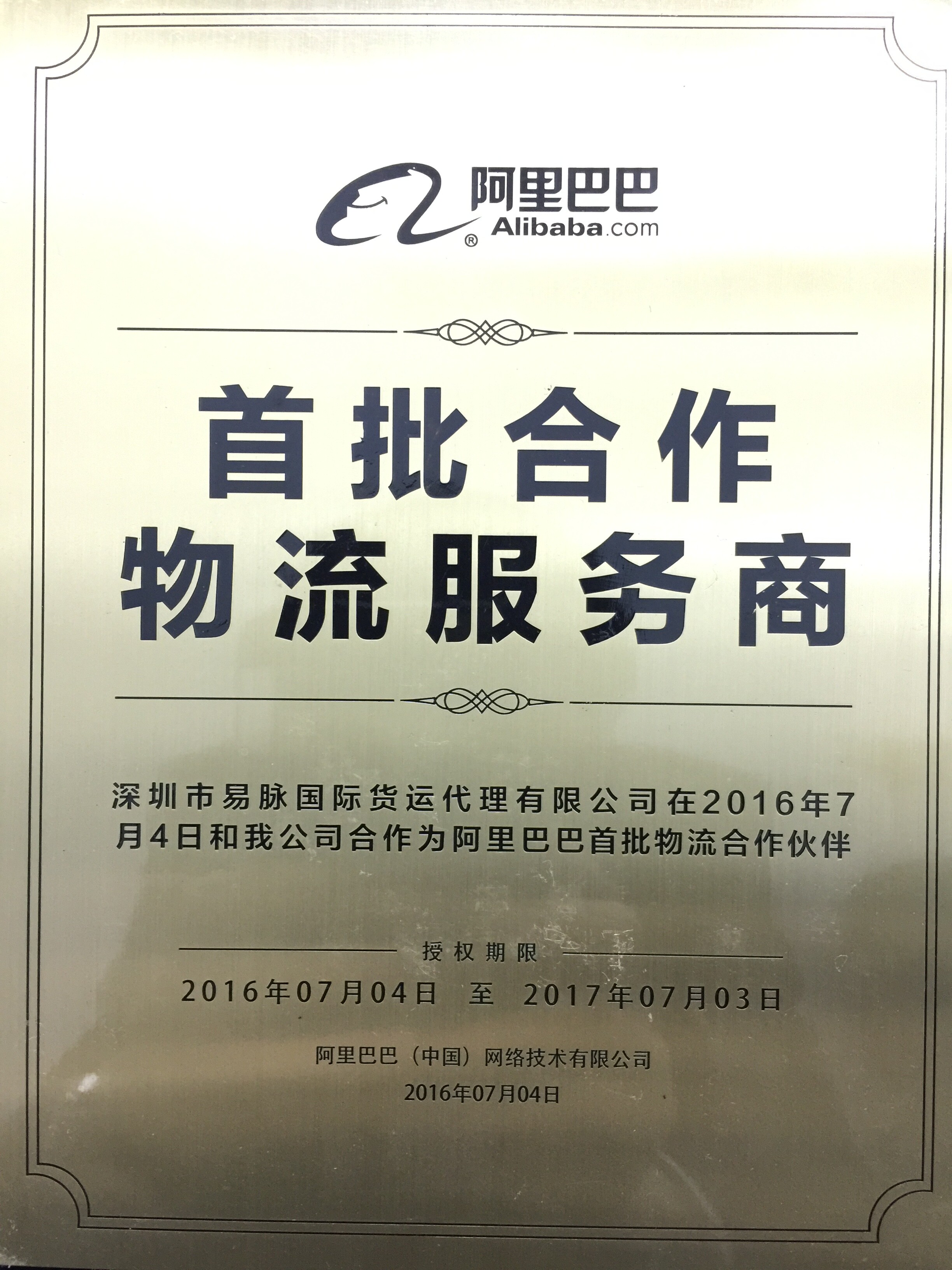 易脉物流作为阿里巴巴的7年金牌供应商、外贸退税一拍档,因其良好服务、具竞争力的价格、完整的国际物流网络,易脉物流于2016年7月成为阿里巴巴的首批合作物流服务商(国际物流)。